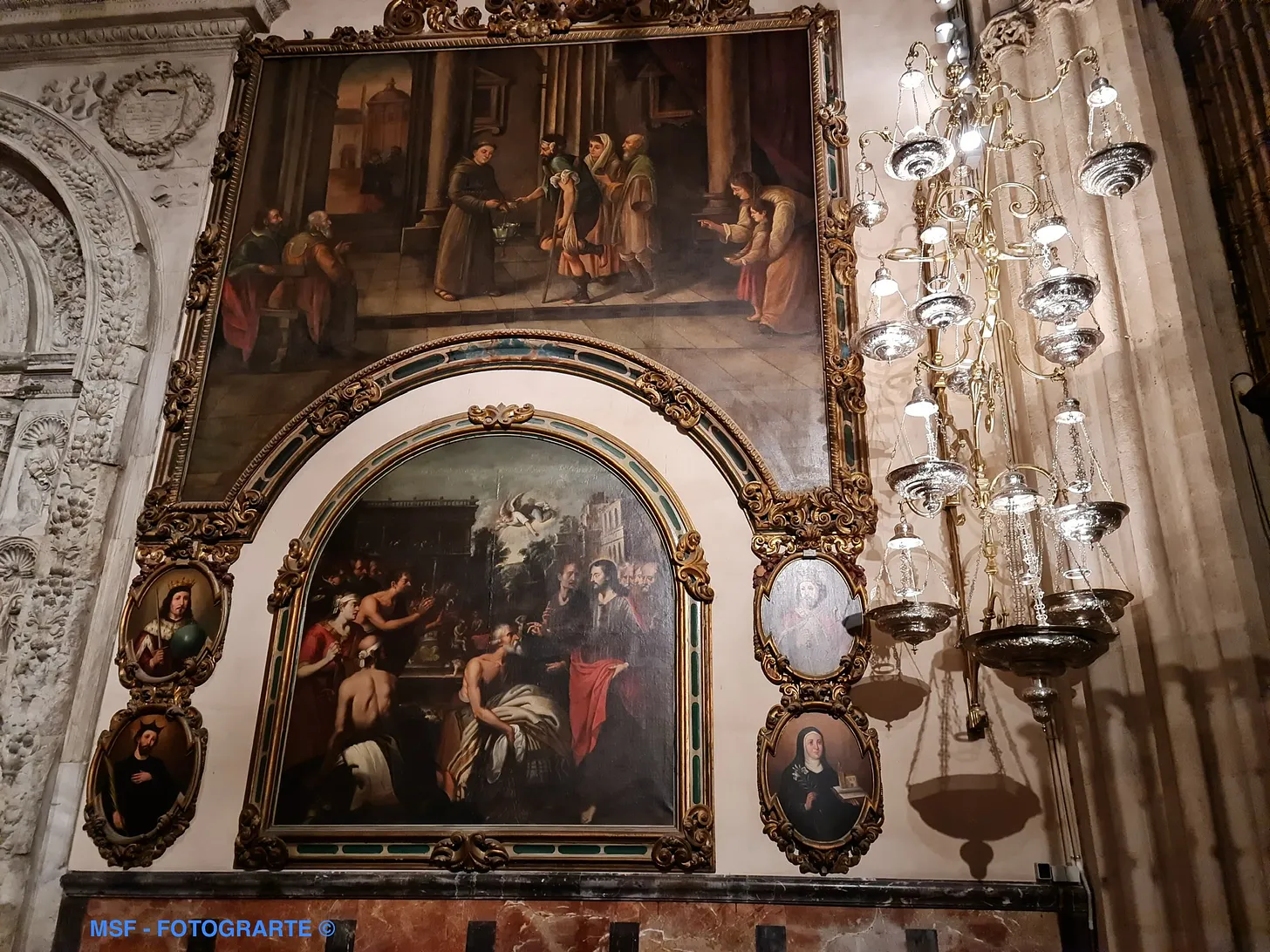 Lado derecho de la capilla. Vista parcial. Podemos ver el retrato de Fernando III el Santo en un medallón en la parte izquierda de la foto. El cuadro central tiene como motivo la curación de un ciego por Jesucristo. / Right side of the chapel. Partial view. We can see the portrait of Ferdinand III the Saint in a medallion on the left side of the photo. The central painting depicts the healing of a blind man by Jesus Christ.