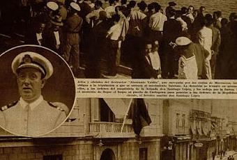 “…cuando a las cinco de la tarde, tal y como tenía anunciado, arriba a puerto el destructor “Almirante Valdés”, viene al mando el capitán jefe de máquinas Santiago López Jiménez y trae prisionera a toda la oficialidad. El Valdés fue objeto de un recibimiento popular apoteósico. Entre vítores y adhesiones a la causa republicana, un enorme gentío lleva a hombros al capitán hasta el Ayuntamiento, donde es obligado a salir al balcón y dirigir un parlamento a la muchedumbre”