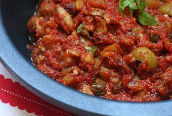 Para 2 personas:2 berenjenas pequeñas; 1 rama de apio; 1/2 cebolla;1 bote de tomate natural; 1 cucharadita de alcaparras;10 aceitunas rellenas de anchoa; 1 cucharada de pasas;1 manojo de albahaca fresca; Aceite; Sal; Sal GordaVinagre de Manzana; 1 cucharadita de azúcar.