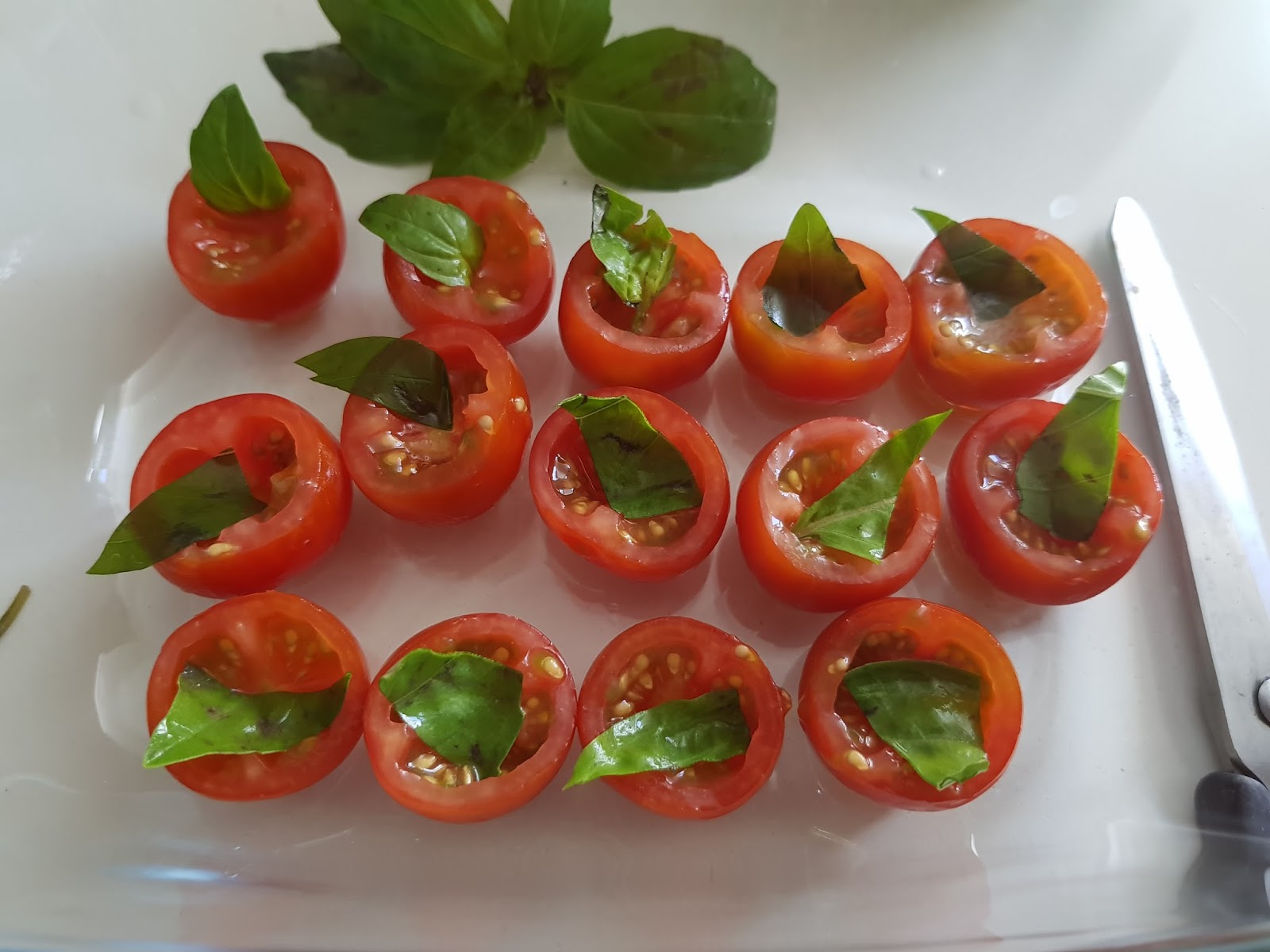 Sólo tardaréis 5 minutos en preparar los tomatitos, y lo dejáis preparado para hornear en el ultimo momento.