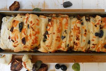 Una vez que ha reposado al masa, retirarla del bol y colocarla sobre al encimera (mesada) enharinada. Aplastar con los dedos para retirarle el gas que genera el leudado. Estirar con rodillo formando un rectángulo de 1 cm. de espesor. Pintar con aceite, colocar la mozzarella rallada, los tomates troceados, las aceitunas troceadas y por último añadir las hojas de albahaca. Cortar cinco tiras de 4 o 5 cm. de ancho.