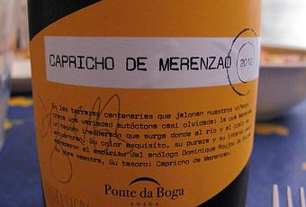 Los viñedos de Adega Ponte da Boga se encuentran en la comarca de Terra de Caldelas, sobre una de las zonas más abruptas del cañón del Sil (DO Ribeira Sacra). A la viticultura heroica que supone trabajar en semejantes pendientes, se suman otras tres características que hacen que este sea un vino especial: agricultura integrada en el viñedo de Costa de Alaïs (de donde sale todo el merenzao -bastardo- de este vino), lo cual quiere decir que sólo tratan en caso de extrema necesidad; cepas orientadas al sur, con una amplia y variada (por temperatura y por humedades recibidas del río) exposición y, por lo tanto, maduración de la uva; suelos de esquisto. Hay que añadir, además, que 2010 fue un año de buenas lluvias (1.215 mm) y, también en su momento, de gran insolación. Y las uvas, como corresponde, se vendimiaron en su justo momento. Aunque el vino reza 100% merenzao, tiene en realidad pequeños, pero interesantes, aportes de sousón, brancellao y mencía (15% entre las tres castas) y toda la vendimia se prolongó del 16 de septiembre al 8 de octubre de 2010.Es la niña de los ojos de Dominique Roujou de Boubée (el consultor enológico de la bodega y padre de la criatura) y el vino es tratado como a tal, con una idea de fondo que salta, a la vista y al paladar, al instante (desde la primera botella que bebí, 2007, hasta este actual 2010): estamos haciendo un vino fino con una de las castas más emblemáticas y de mayor calidad del interior de Galicia (bastardo = merenzao, Ribeira Sacra y Monterrei), que tiene que transmitir lo mejor de la uva y de la zona: momentos de frescura, otros de calidez, suave tensión, intenso aroma y sabor en boca (tanino tan suave y dócil como persistente) pero con un trago largo y accesible, ágil y, casi, atlántico (pero de más al norte, del Loire o Cahors...). Un vino con 13,6% y una acidez elevada en tartárico (5,2): el uno equilibra a la perfección a la otra y aunque Capricho de Merenzao 2010 sea un vino que vivirá bastantes años y evolucionará hacia una complejidad mayor, está ya ahora mismo, en una fase de espléndida juventud. Solo fermenta el mosto flor (nada de prensa), se combinan maderas viejas (60%) y acero durante 10 meses (también para la maloláctica) y el vino reposa en botella diez meses, antes de salir al mercado. 2.814 botellas a 24€ aprox.