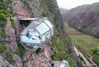 Se encuentran en Valle Sagrado, Perú, y son 3 capsulas vivienda diseñadas para pasar la noche suspendidos a mas de 400 m de altura.