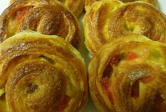 Una vez que tengamos la masa para Croissant. Se estira la masa y se espolvorea azúcar solo por encima y se pone fruta caramelizada picada en cuadraditos.