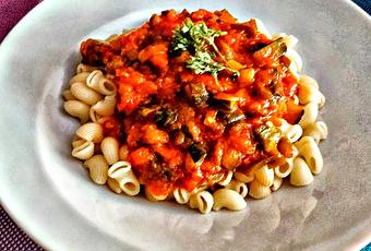 Ahora cortaremos las verduras en trozos pequeños y los ponemos a pochar en otra sartén a fuego lento con un chorrito de aceite de oliva y una pizca de sal, dejaremos pochar hasta que las verduras comiencen a ablandarse, una vez conseguido ese punto le ponemos la salsa de tomate, pero antes le quitaremos a las verduras el exceso de agua que han soltado y lo dejamos a fuego lento cocinar.