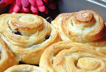 Nos ponemos con las caracolas para ello extendemos la masa con cuidado de no deformarla, pinzamos las separaciones y cubrimos con la crema con la ayuda de una cucharada pero dada la vuelta (no poner demasiada para evitar que se salga después) Repartimos las pepitas de chocolate y la naranja, volvemos a enrollar con cuidado. Obtenemos un cilindro y cortamos rodajas de 1-2 cm de grosor, y las pondremos en la bandeja de horno con papel, yo en este caso he utilizado una bandeja de BRA, antiadherente y así quedaban todas bien juntas, si las separas en el horneado quedarán mas redonditas. Pincelamos con mantequilla derretida e introducimos en el horno precalentado a 180º C durante unos 18 minutos, cuando veamos que están doraditas.