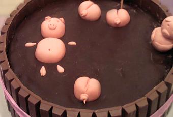 La idea no es original, ya que se guió por una página de internet que te enseñaba como hacer esta tarta de chocolate en forma de charca con cerditos pero le quedó igual, lo único que la original lleva nocilla por encima y esta es de cobertura de chocolate negro.