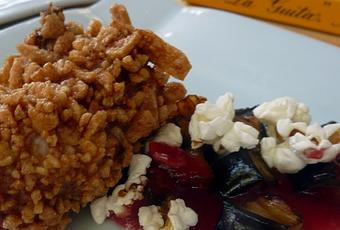 Se pasan por el huevo batido y el pan rallado ligado con el maiz picado a trocitos y se fríen en abundante aceite caliente, esto hara que el maiz se sufle y se hagan palomitas. Se escurren bien y se reservan, Servimos acompañado de unas berenjenas Salteadas con ajo fritos y una palomitas por encima de las berenjenas.
