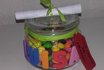 Irene me pidió un detallito personal para su seño, no teníamos mucho tiempo, así que estuvimos pensando, pensando... hasta que decidimos que sería un dulce detalle, unos caramelitos. Primero pensamos en unos lacasitos, pero nos daba miedo que se derritieran con la calor. Y nos acordamos de los Skittles, caramelitos dulces, pequeñitos, de colorines y lo mejor... con una S de Superseño.