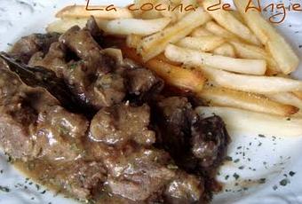 - Salpimentar y espolvorear nuez moscada a 1 kg. de carne de ternera para guisar, y sofreírla junto a la cebolla. Añadir cerveza belga (o negra) sin que llegue a cubrirlo del todo. Cuando hierva, remover un poco y ponerle 3 hojas de laurel y 2 rebanadas de pan de molde, previamente untadas con mostaza por las 2 caras. Dejar cocer a fuego lento durante 3 horas aprox.