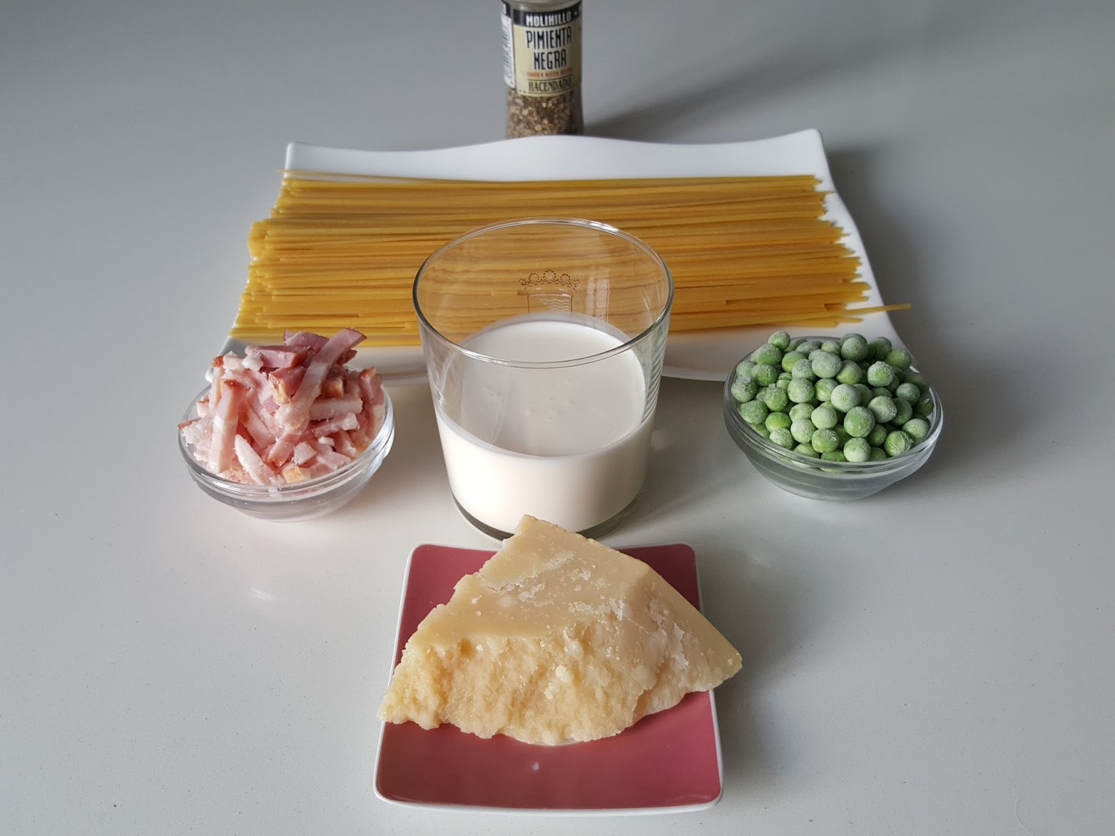 80 gr de pasta por cabeza Bacon troceado (yo puse 50 gr para 2 )Guisantes congelados (50 gr para 2 personas)100 ml de nata o crema de lecheSal y pimientaQueso parmesano