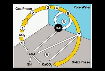 El mecanismo de la reacción de carbonatación inducida es distinto de la de la carbonatación natural. La reacción general de dióxido de carbono con el silicato tricálcico y fases silicato dicálcico en el cemento fue descrita en 1974 por Young como: