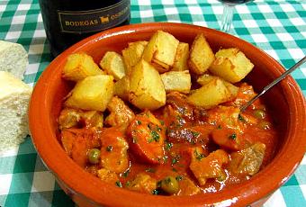 1 kilo de magro de cerdo en pedazos no muy grandes3 chorizos caseros curados200 gramos de jamón serrano en tacosSalsa de tomate frito casero1 Lata de guisantes 1 Pimiento verde1 Pimiento Rojo3 dientes de ajo1 cebolla1 Cayena1 hoja de laurel1 vaso de vino blanco "Solaz"250 cc. de caldo de carneAceite de oliva virgen Sal