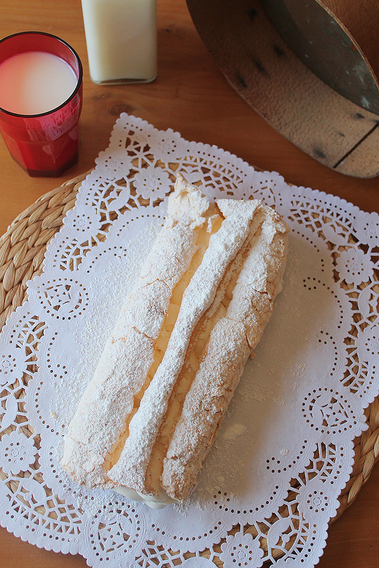 La obtuve estudiando el posgrado en la escuela de cocina. Aunque la explicación parezca que no tiene final y sean varias elaboraciones para un mismo fin, no os preocupéis. Es fácil de hacer, sino ya os avisaría de antemano.Hay tres pasos fundamentales para realizarla: hacer un merengue, un bizcocho de soletilla y montar nata con azúcar. La dificultad principal es el merengue, que lo haremos italiano. Eso quiere decir que primero haremos un almíbar a punto de bola fuerte, el cual después incorporaremos a las claras semi montadas. Si tenéis termómetro de azúcar es mucho mas cómodo, solo tienes que asegurarte que el almíbar llegue a los 120ºC y listo. De lo contrario, para comprobar el punto del azúcar, debes sumergir una cuchara en el almíbar, dejarla escurrir un poco y posteriormente sumergirla en un vaso con agua natural. Dejamos unos segundos que se entibie para no quemarnos los dedos. Cogemos parte del almíbar enfriado con la cuchara e intentamos formar una bola, si ni siquiera se forma una bola debemos dejarlo cocer mas tiempo. Sabremos que esta listo cuando podamos formar una pequeña bola dura entre los dedos.
