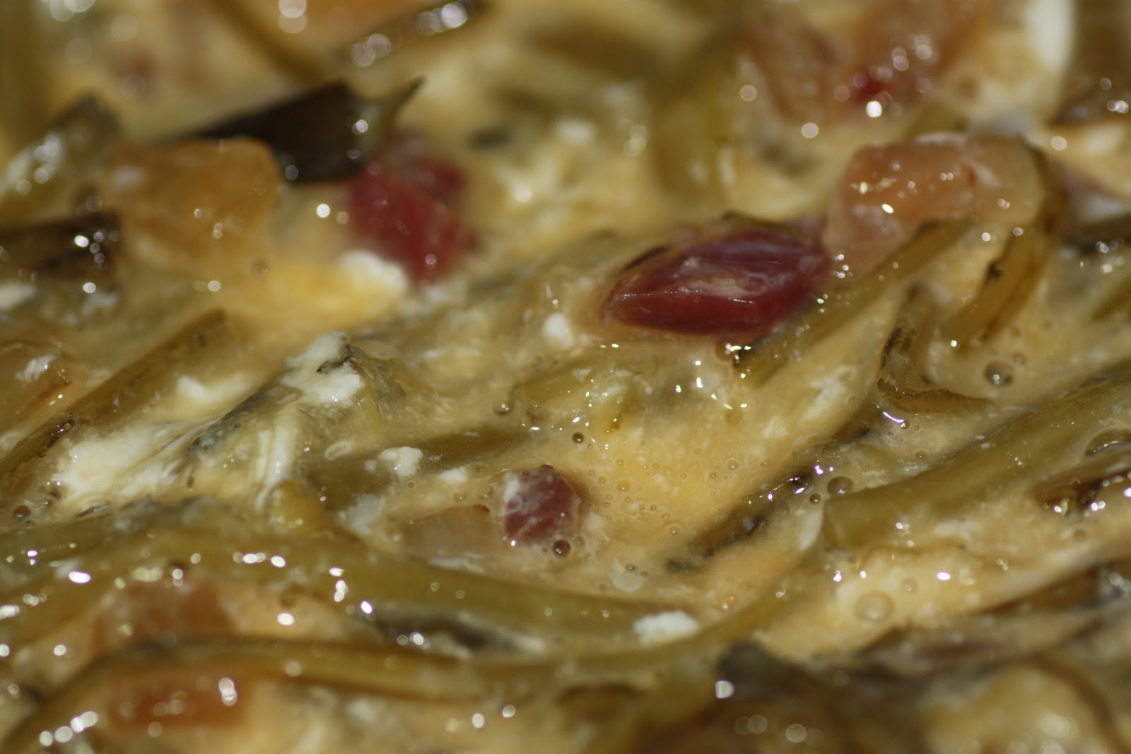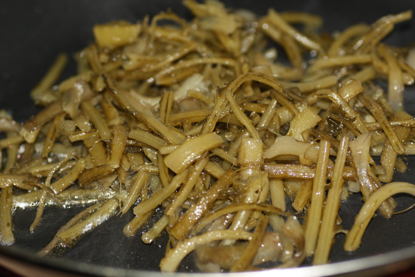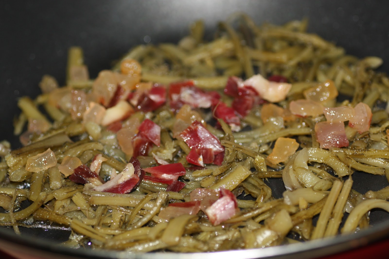 Como tampoco hay que exagerar, decidí comenzar dandole un toque de sabor a la verdura, rehogándola en la grasa que soltara el tocino del jamón, sin usar aceite. Tras un minuto en la sartén, retiré el tocino y añadí una buena ración de cardillos, calculo que unos 100 gramos de cardillos ya cocidos, y los mantuve en movimiento durante unos cinco minutos a fuego medio.