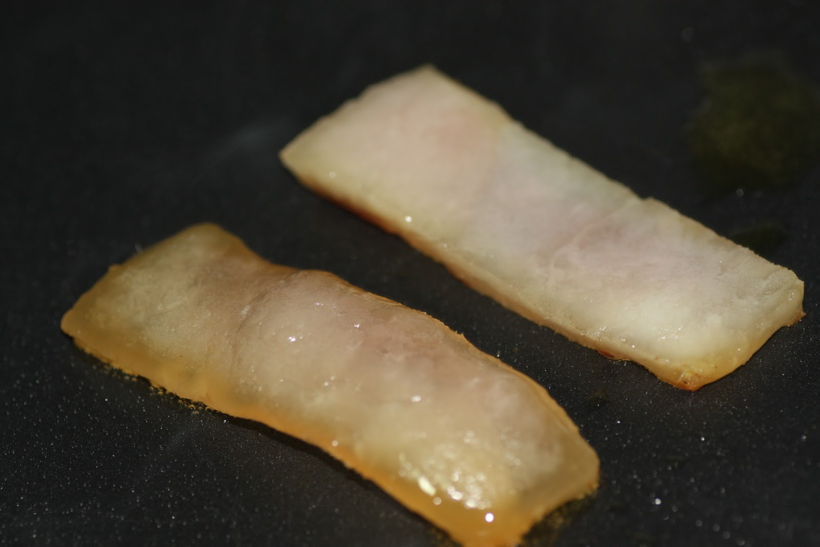 Ahora, añadimos unos taquitos de jamón y unos tocinitos cortados muy finos a la sartén y seguimos rehogando.