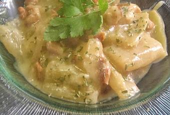 2º " En una sartén ponemos un poco de aceite de oliva, añadimos las nueces troceadas y una cucharada de harina, dejamos que se fría un poco y rápidamente añadimos un poco de caldo de la cocción de los cardos, añadimos los cardos y acabamos rectificando de sal.