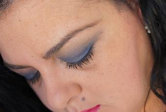 El look es bastante sencillo, básicamente se trata de un ahumado en azul con un toque de luz dorada en el lagrimal.