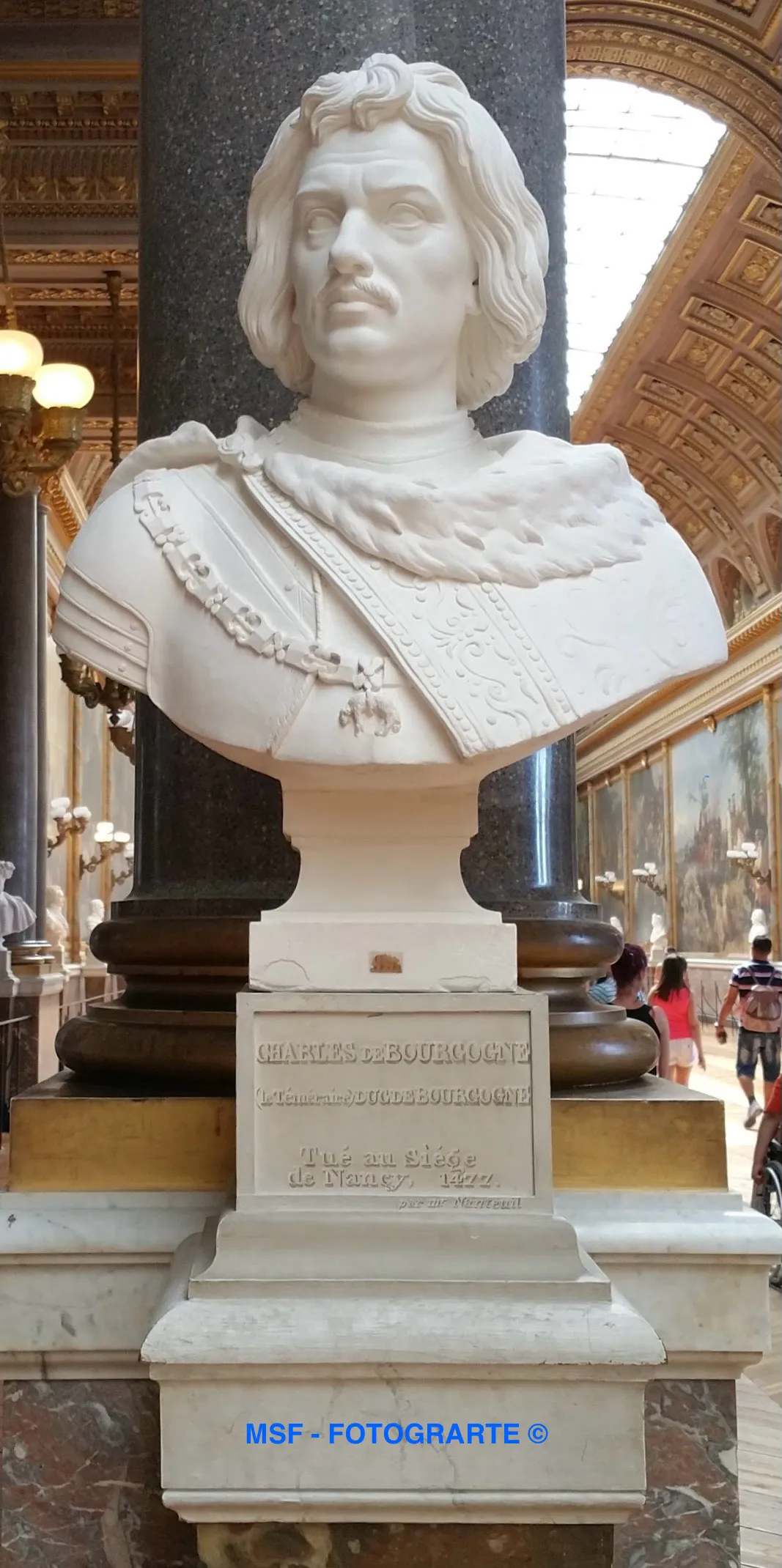 Pero hoy tenemos que hablar de su abuelo Carlos, que, como vemos, lleva en este busto, el Collar de la Orden del Toisón de Oro, del que hoy es Gran Maestre de la rama española, el Rey Felipe VI y de la rama austríaca, Carlos de Habsburgo-Lorena, jefe de la casa real austriaca. Todo ello como consecuencia de la muerte de Carlos II y la guerra de Sucesión española. Pero, volvamos a Carlos el Temerario: