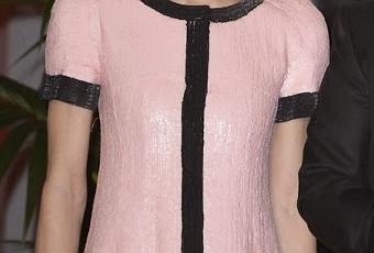 Chalotte Casiraghi eligió un vestido de paillettes, midi, de manga corta en tono rosa con ribetes en gris, de Chanel Alta Costura, Primavera 2015, que combinó con zapatos de salón, también de Chanel.
