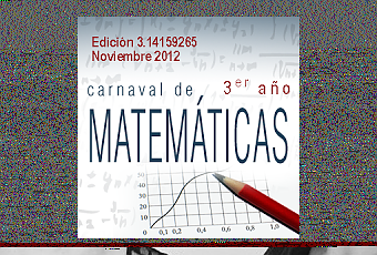 Hoy 12-12-12, fecha curiosa en el calendario que para que se repita que vuelvan a coincidir el número del día, del mes y del año, sera el 01/01/01, hay que esperar a cambiar de milenio: el 3001, buen día para empezar la siguiente edición del Carnaval de MatemáticasPara participar en esta edición, no hay más que seguir la tradición y (noooooooo, comer turrón y/o mantecados, no es necesario para participar en la edición). Proseguimos. PAra participar no hay más que escribir tu entrada e incluir links a la web del Carnaval de Matemáticas y otro al blog anfitrión.