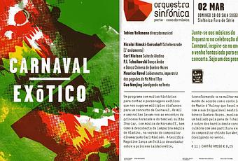 Domingo 2 de marzo, 18:00 horas. Casa da Música, Oporto: Sala Suggia. "Carnaval Exótico": Orquestra Sinfónica Do Porto Casa da Música, Tobias Volkmann (director). Obras de Rimski-Korsakov, Nielsen, Tchaikovsky, Ravel y Guo Wenjing. Entrada: 11€ (concierto fuera de temporada).Rezaba la publicidad del concierto "Júntese a los músicos de la orquesta en la celebración del Carnaval inspirado este año en Oriente y venga disfrazado para este concierto", por lo que el ambiente que se respiraba en la sala principal que lleva el nombre de la famosa cellista local Guihermina Suggia era festivo totalmente, y con aforo completo. Los músicos también iban ataviados y la decoración mínima pero suficiente: globos, puertas orientales, pantalla con sombras chinescas y una inmensa lámpara de Aladino en cartón piedra de la que salió con humo el mago director brasileño Volkmann, luego mudado a mandarín.