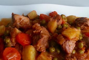 600 o 700 gr de carne de cerdo troceada.150-200 gr de guisantes congelados.2 o 3 zanahorias (250 gr)2 cebollas (500 gr)2 dientes de ajo2 cucharadas de tomate triturado1 copa de FinoSalAceite de oliva