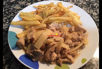 _ 600 grs de ternera en filetes( yo puse cerdo)_ 1 bote de setas chinas_ 2 botes de bambú_ 1 cebolla grande_ 1 ajo_ 1 cucharadita de jengibre en polvo_ 1 pastilla de concentrado de carne_ 2 vasos de agua_ 1 huevo_ Maizena_ Salsa de soja_ Aceite de girasol_ Sal