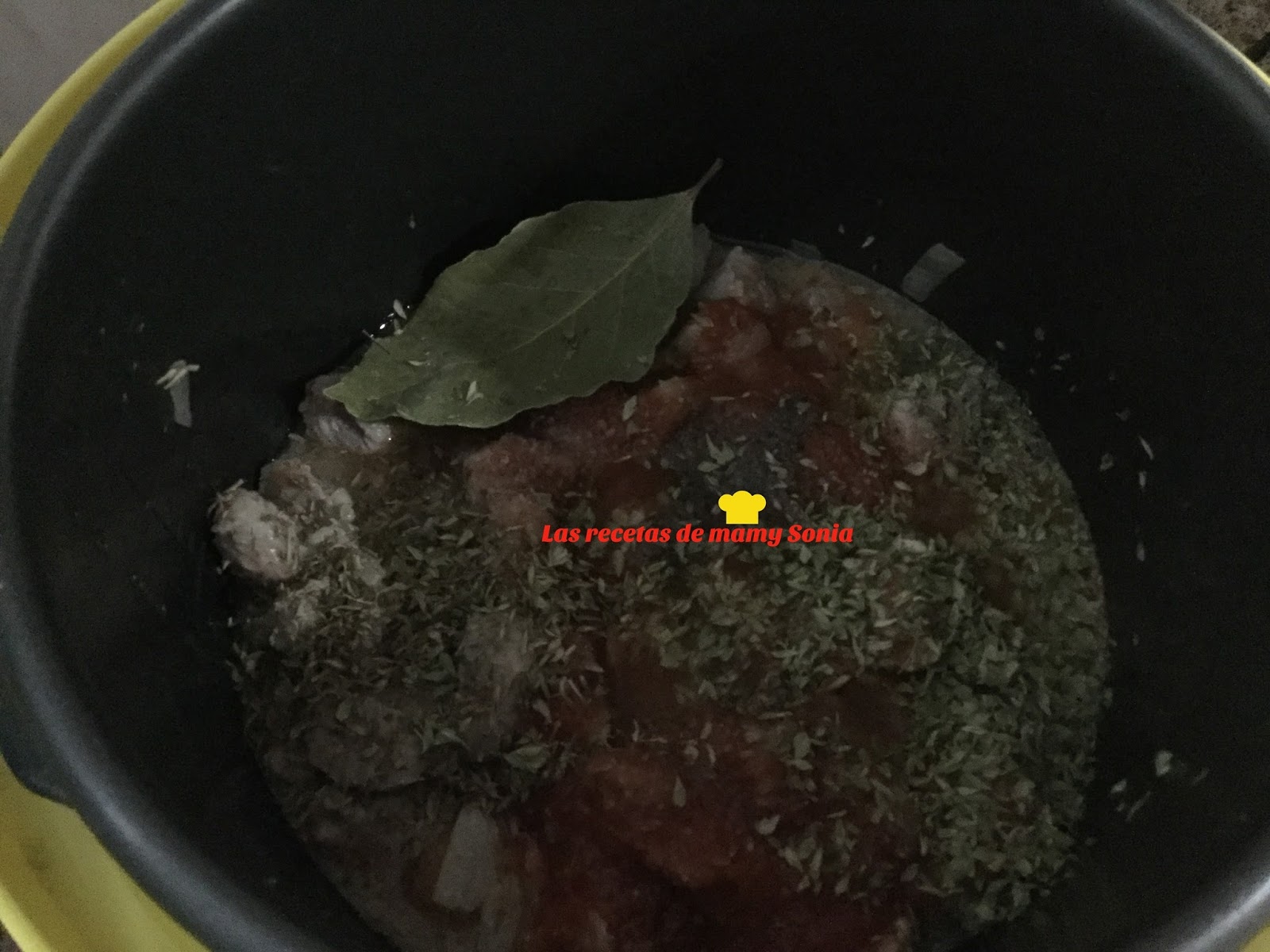 Añadimos el tomate triturado junto con la pastilla de caldo concentrado de verduras, la pimienta, la sal, el laurel y una pizca de tomillo y orégano.
