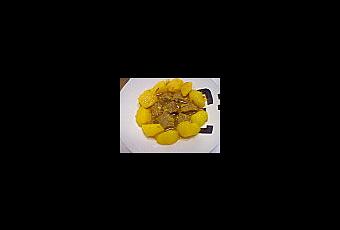 Éste es el texto exacto que escribió mi abuela. He cocinado la carne respetando la receta casi en su totalidad. He cambiado el tipo de recipiente, y he sustituido el perol por una olla exprés con el fin de que la carne se pusiera blanda en menos tiempo. Esta acción me ha obligado a añadir el agua (un vaso entero) no poco a poco, sino de una sola vez. He cerrado la olla y la he dejado 20 minutos a presión. Pasado ese tiempo, la he abierto, he comprobado que la carne estaba tierna y he añadido las patatas troceadas. He vuelto a cerrar la olla y la he dejado a presión 5 minutos más, tiempo suficiente para que las patatas se pusieran blandas sin desbaratarse. Finalmente, he colocado la carne con la salsa en el centro de un plato hondo y lo hedecorado poniendo las patatas alrededor, tal como se ve en la imagen que ilustra esta crónica. Después, mi hijo y yo nos la hemos comido con mucho gusto. La carneestaba muy tierna y la salsa, sabrosísima. ¡Os animo a probarlo! Su preparación es sencilla y si optáis por guisarla en la olla, como yo he hecho, se tarda poco tiempo. ¡Feliz -y si es fogoso, mejor- fin de semana!