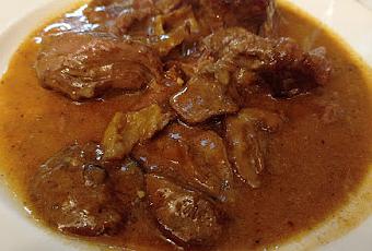1 kg de ternera cortada fina2 cebolla2 tomates maduros o sofrito casero400 g de setas frescas variadas1 vaso de vino blanco o vino rancioAguaHarinaPimienta negra molida2 hojas de laurel1 ramillete de tomilloAceite de olivaSalPara la picada:Un puñado de almendras y avellanas tostadas2 dientes de ajoUnas ramitas de perejilElaboración:Salpimentar la carne y pasar ligeramente por harina.Poner en una sartén o cazuela plana aceite y freír la carne, no mucho. Retirar y reservar.Cortar las bases de las setas y limpiar las setas con papel de cocina húmedo, que no quede tierra. Saltear las setas en una sartén con un poco de aceite. Reservar.Pelar y picar las cebollas y los tomates.En la cazuela de freír la carne, añadir la cebolla y unos minutos después incorporar el tomate y sofreír. Añadir más aceite si hace falta.Cuando el sofrito esté, agregar el vino y dejar reducir. Triturar.Poner la salsa a la cazuela y añadir 1/2 vaso de agua o de caldo.Poner la carne, y cocinar hasta que esté tierna.Quitar el laurel y el tomillo.A continuación, incorporar las setas y la picada, remover y dejar cocer 10 minutos más.
