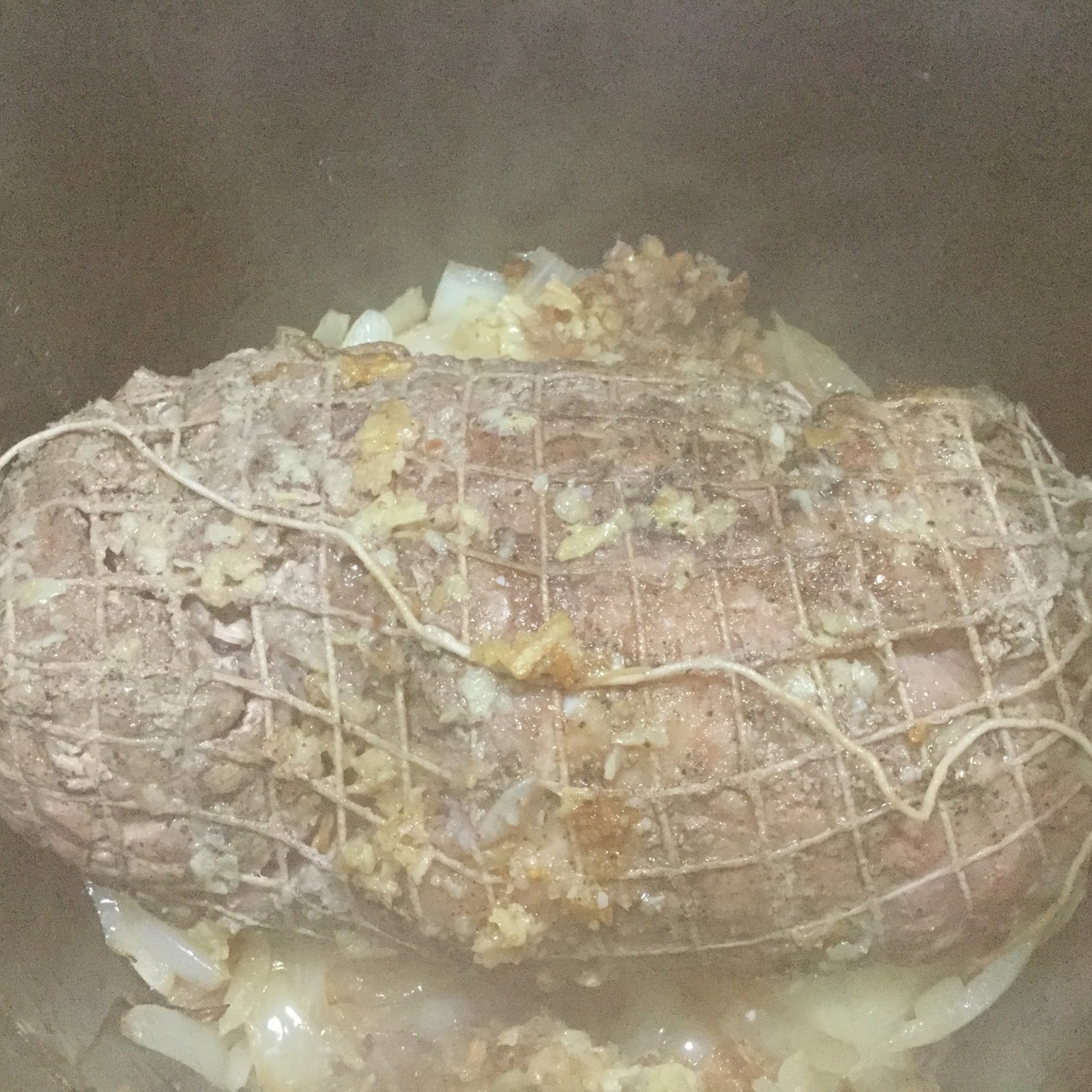 _ 2.500 kg de de carne de cabeza en un trozo( es más jugosa que la de lomo)_ 4 cebollas grandes_ 1 cabeza de ajo_ Aceite de oliva_ Pimienta_ Nuez moscada_ 2 hojas de laurel_ 2 vasos medidores de vino blanco_ 1 pastilla de caldo_ Sal