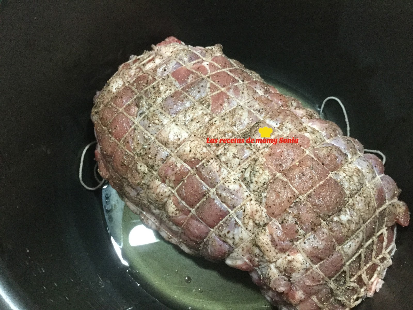Lo primero que vamos hacer es espolvorear de pimienta y nuez moscada nuestra carne la cual habremos dicho al carnicero que le poncha una red, la untamos bien. Pasamos a la cubeta y la doramos en Menú Plancha 130º