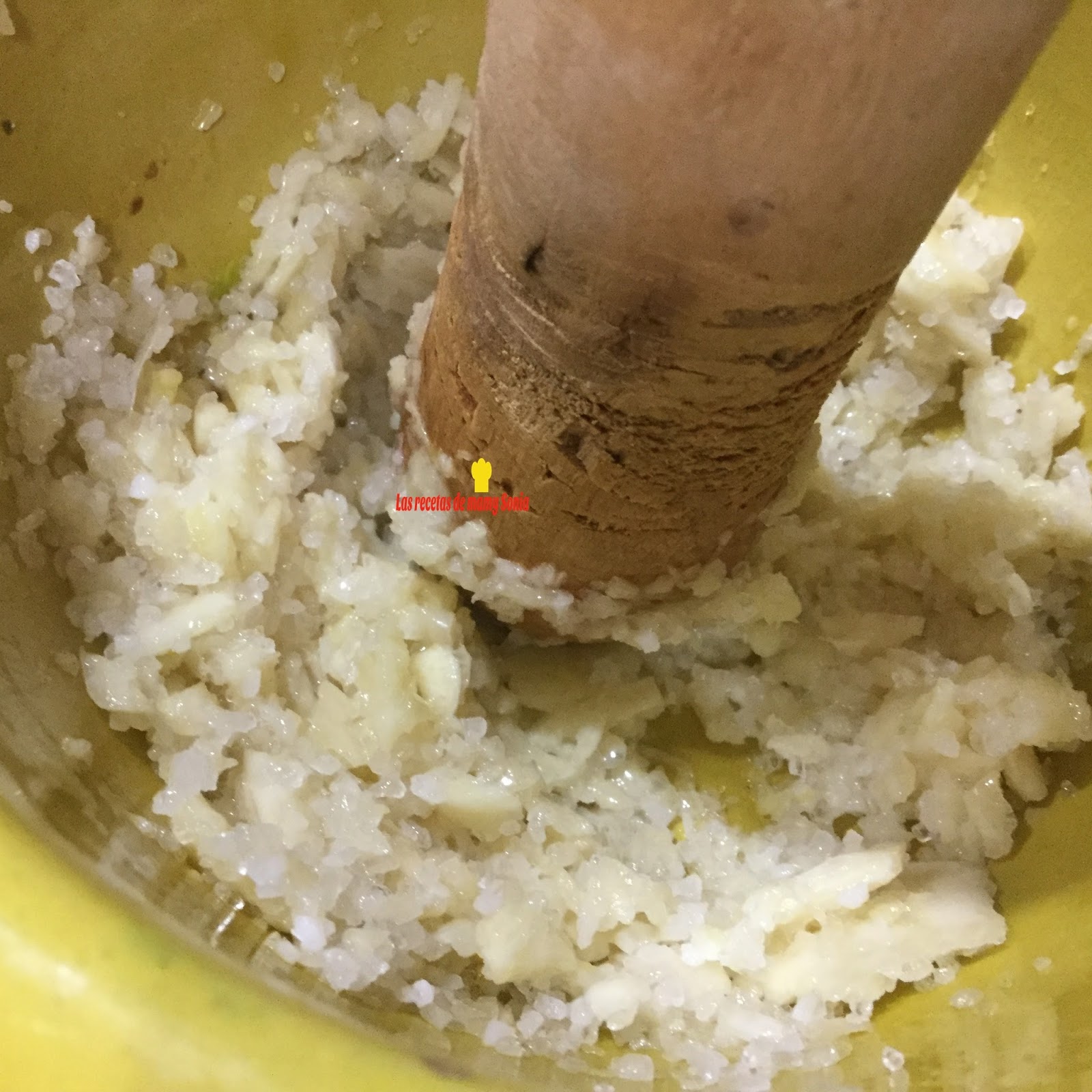 Mientras en el mortero majamos la cabeza de ajo junto con la sal hasta obtener una pasta se la vamos poniendo a la carne pinchadola con un tenedor, así hasta que la tenemos dorada por todas partes.