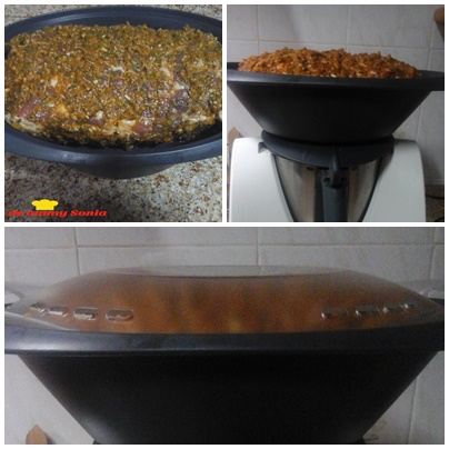 Ponemos la carne en el Varoma y en su posición sobre la tapa, y programamos 30 minutos a temperatura Varoma Vel/cuchara, le damos la vuelta al rollo de carne y programamos otros 30 minutos a misma temperatura y vel.,