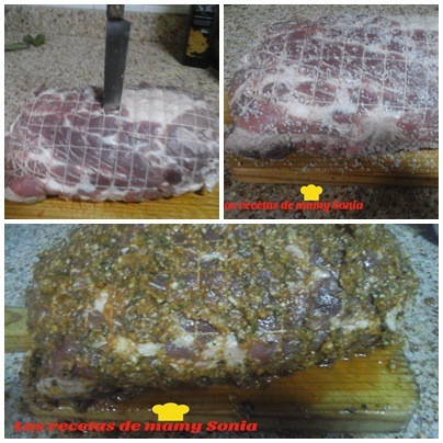 PREPARACIÓNTrituramos los ajos y la cebolla en velocidad 5, unos segundos, luego le añadir las especias y las pastillas de caldo, menos el laurel y mezclamos unos segundos a velocidad 4, esté majado se introduce a la carne por unos agujeros que se le hace, lo suyo es un aparato de esos de mechar, añadir la sal y poner en una redecilla (si se tiene).