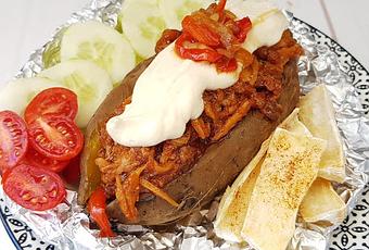 - Rellenamos las batatas con la verdura, encima colocamos varias cucharadas de "carne" de boletus y de crema agria de tofu. ¡Listas para servir!
