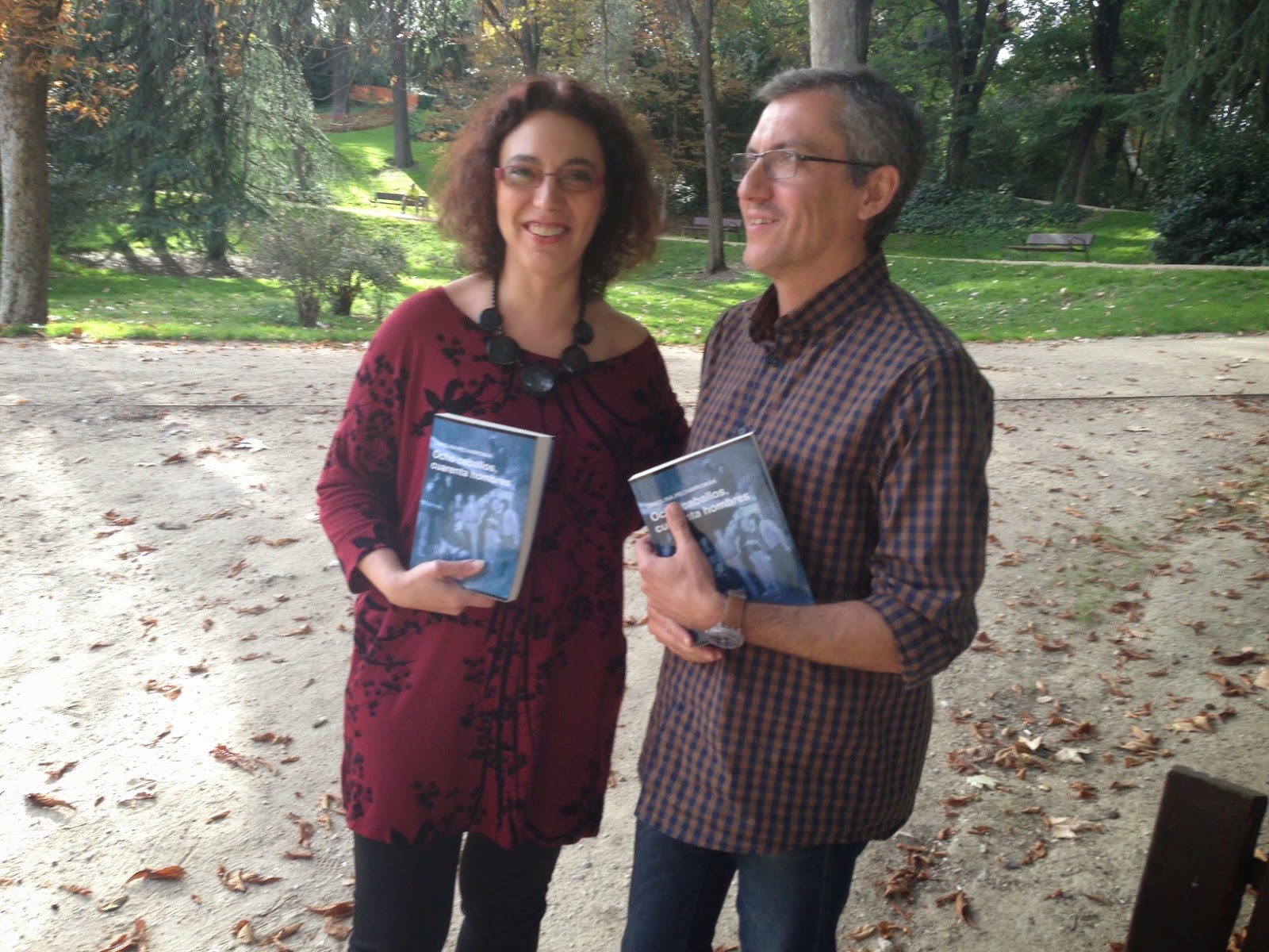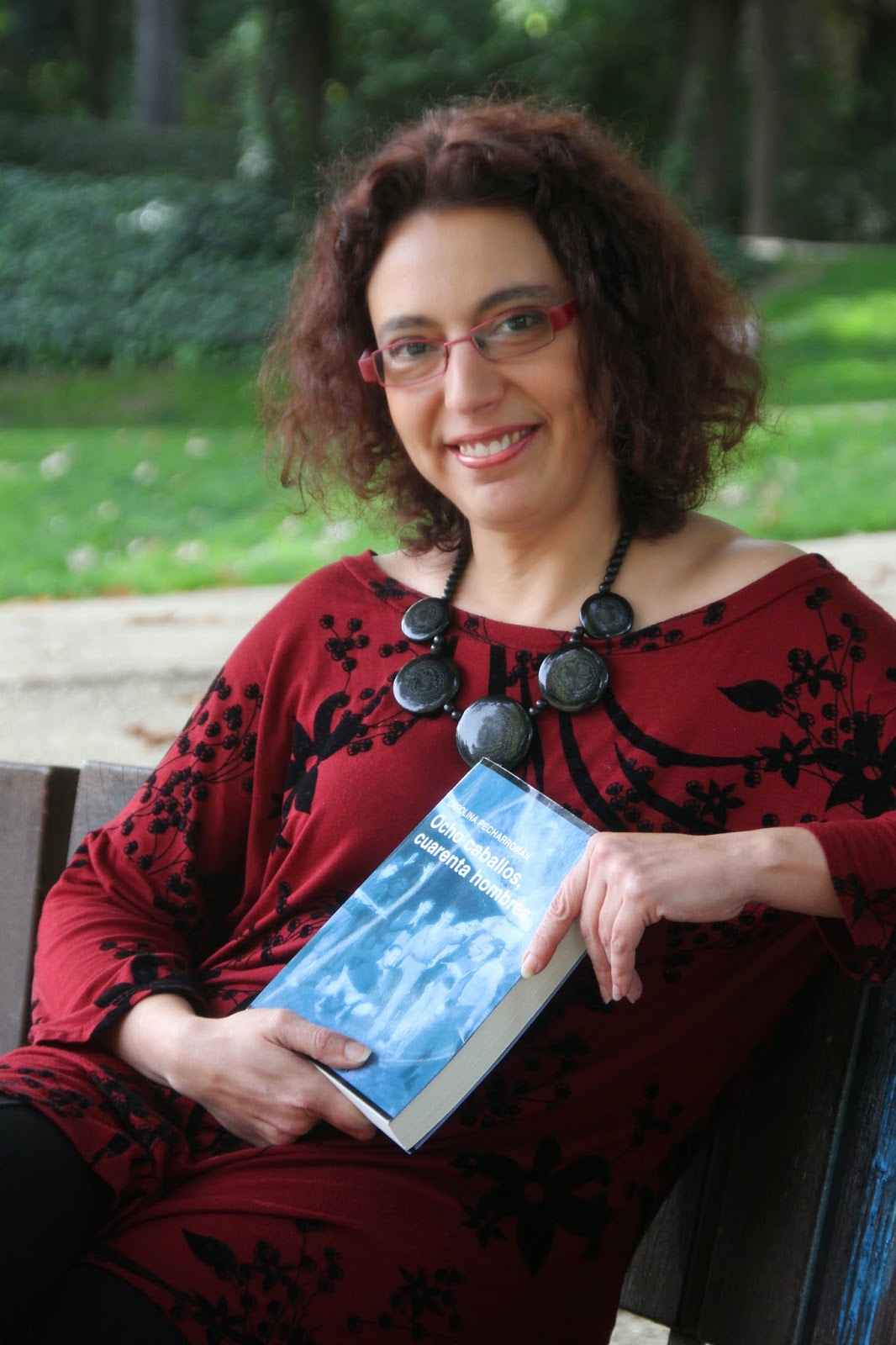 Tal como medio aseguré en el post en una reciente entrada iba a buscar a la autora de Ocho caballos, cuarenta hombres. Y lo he hecho, quedamos en el madrileño parque de la Fuente del Berro de una soleada tarde. Con buena luz, para que Fran Lorente, cuarentón desde hoy, no tuviera problemas de iluminación a la hora de hacer alguna foto. Madrileña de la quinta del 69, Carolina Pecharromán acaba de publicar su primera novela, Ocho Caballos, cuarenta hombres, ambientada en el Madrid de la guerra y principio de la postguerra. Licenciada en Geografía e Historia y periodista vocacional; “siempre he trabajado como periodista”, insiste; actualmente coordina la información internacional de los telediarios en TVE. Su novela es una historia de la guerra, pero también de amor y misterios. Una historia escrita desde las entrañas porque buena parte de ella está basada en hechos reales relatados por su familia.