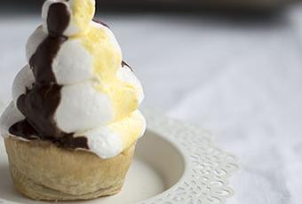 El pastel se compone de un cestito de hojaldre, clásicamente rellena de una masa de coco, aunque a mi, personalmente, me gusta más rellena de pastel de arroz (otra delicia típica de Bilbao), que lleva un merengue por encima adornado con yema de huevo y chocolate.
