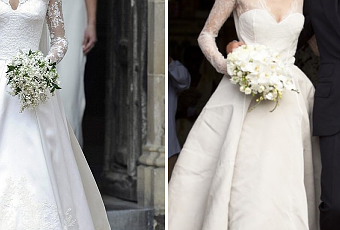 Ambos trajes son muy similares. El encaje de Trentini es más ligero y transparente que el de Kate, y no le llega al cuello, y además el tejido es diferente, mucho más rico el de la actual Duquesa de Cambridge e impecable sin una arruga, (la falda del vestido de Caroline salió arrugado de la iglesia), pero inevitablemente cuando vimos el vestido de Caroline, nos acordamos inmediatamente del que lució la esposa del Príncipe Guillermo.