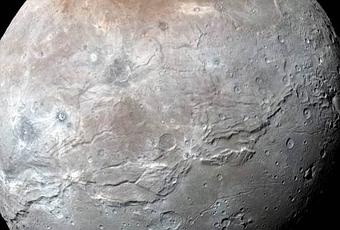 El satélite más grande de Plutón, muestra la oscura y misteriosa región polar del norte conocida informalmente como Mordor Macula. La captó el 14 de julio la sonda New Horizonts cuando se encontraba cerca del máximo acercamiento y la transmitió el 21 de septiembre a la Tierra. Los datos combinados del azul, del rojo y del infrarrojo se han procesado con el fin de realzar los colores siguiendo las variaciones de las propiedades de la superficie con una resolución de unos 2,9 kilómetros. Caronte tiene 1.214 kilómetros de diámetro, aproximadamente una décima parte del de la Tierra, pero nada menos que la mitad del de Plutón, lo que le hace ser el satélite más grande en relación a su planeta de todo el Sistema Solar. Esta imagen del hemisferio de Caronte encarado a Plutón pone de manifiesto el cinturón relleno de fracturas y de cañones que aparentemente rodea el satélite y que parece separar las lisas llanuras del sur del variado terreno del norte.