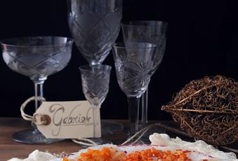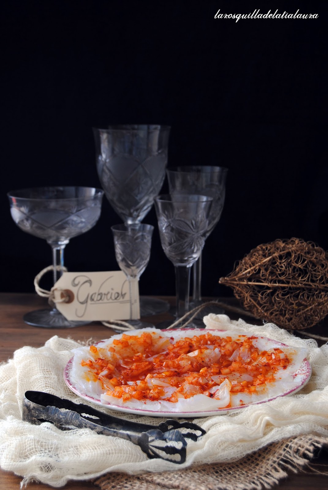 Hoy os traigo un plato maravilloso, de esos simples que con pocos ingredientes pones encima de la mesa algo realmente bueno.A mí me encanta el bacalao en todas sus versiones, pero desalao en platos frios como la esqueixada o este plato de hoy me encanta.El truco está en usar productos de buena calidad. Vale la pena gastarse un poquito más comprando un buen bacalao y desalarlo con paciencia y mimo. Yo a veces lo compro desalado por ellos en la tienda en el caso de no tener tiempo.Sumando un buen bacalao, un buen aceite de oliva, una cebolla dulce y pimentón ahumado tienes esta maravilla! Hace muchos años que mi Tia Majo lo pone en la mesa en estas fiestas, y la verdad es que es un entrante fácil, rico y muy resultón.Así que esta entrada va dedicada a ella, una de mis más fervientes seguidoras :) . Aunque a parte del plato en sí, no me digáis que las copas no son preciosas...son de la boda de mis abuelos y las guardo con mucho cariño.Bueno...os cuento: