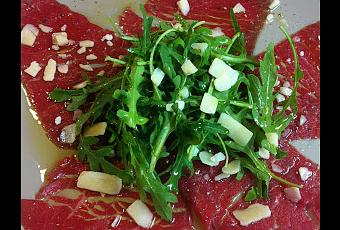 El carpaccio es una elaboración italiana que consiste en carnes crudas cortadas muy finas y aderezadas con aceite o mayonesas especiadas.
