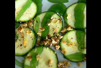 Servimos en un plato nuestras laminas de calabacín , la vinagreta por encima y el vinagre balsámico de manzana por encima .