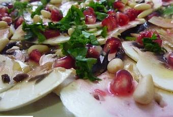 Desgranamos la granada, la reservamos intentando guardar el zumo que suelta. Limpiamos los champiñones y los cortamos en lascas finas con la ayuda de una mandolina. Disponemos los champiñones en un plato y los regamos con el zumo de lima dejando unos pocos minutos. Luego los pasamos a la fuente de presentación, le añadimos por encima los piñones, la granada. Echamos un buen chorro de aceite de oliva y picamos por encima el cilantro y la hierba buena.