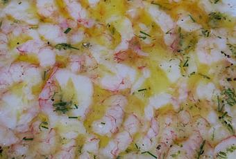 Distribuir el aliño por todo el carpaccio, volver a meterlo en la nevera para que coja el sabor del aliño y conseguir que se cocine la carne de las gambas con el zumo de limón.
