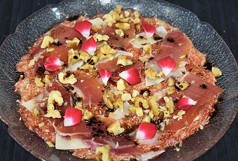 Cuatro higosQueso parmesanoLoncha de Jamón serranoDos cucharadas de aceite de oliva virgen extraSeis gotas de vinagre balsámicoDos nuecesPétalos de rosa enanaPreparación: