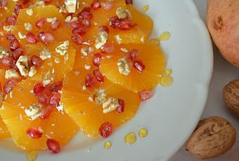 Ingredientes: 4 personas4 naranjas1 granada2 cucharadas de miel1 cucharada de esencia de azahar (opcional)6 nueces