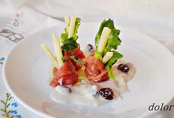 Emplatar: poner un poco de la salsa de queso con arándanos y encima, de pie, los rollitos de carpaccio.