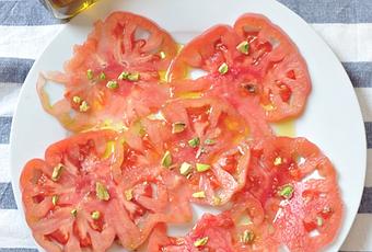 La nueva receta se ha hecho esperar pero creo que vengo con un recetón, veraniego, sano y muy muy rico, un carpaccio de tomate de la especialidad monterosa con un buen aceite de oliva (en este caso de Coosur sin filtrar), y con pistachos que le van a aportar a nuestro carpaccio un toque crujiente absolutamente delicioso.